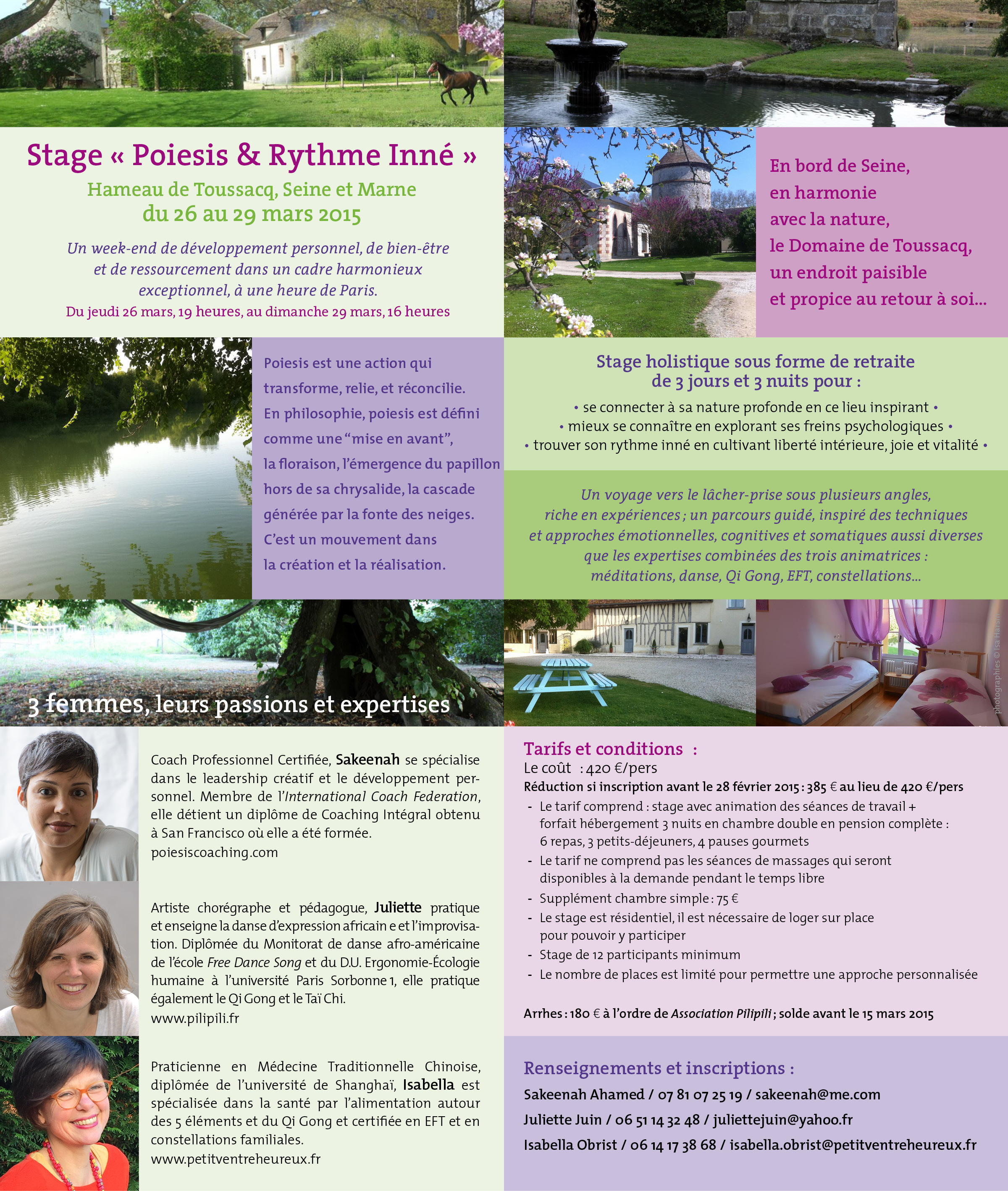 Notre premier stage en collaboration avec Juliette et Isabella… Un projet de longue date, qui prend enfin vie… Nous espérons que vous pourrez vous joindre à nous pour ce w-end qui promet d’être enrichissant dans bien des domaines, à plusieurs niveaux… Un travail à la fois profond et poétique, en douceur et en rythme…